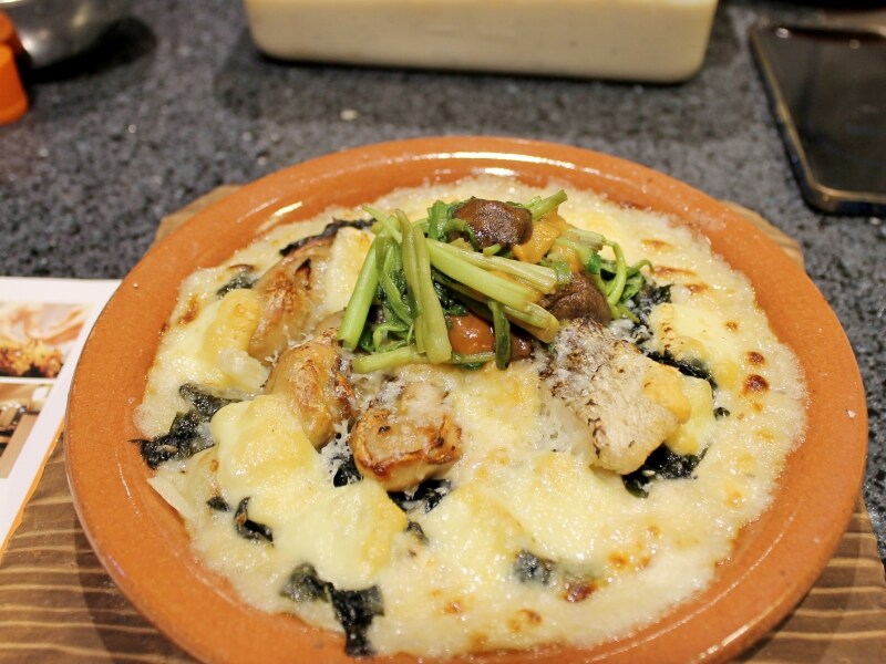 提供時には目の前でバーナーを入れて仕上げるため、焼き立てのこうばしさとチーズの香りが立ち上り、食欲を一層かき立てます。 下処理を最小限に抑えたタラと牡蠣の旨み、ワカメの磯の風味が溶け合い、最後まで飽きのこない味わいでした。