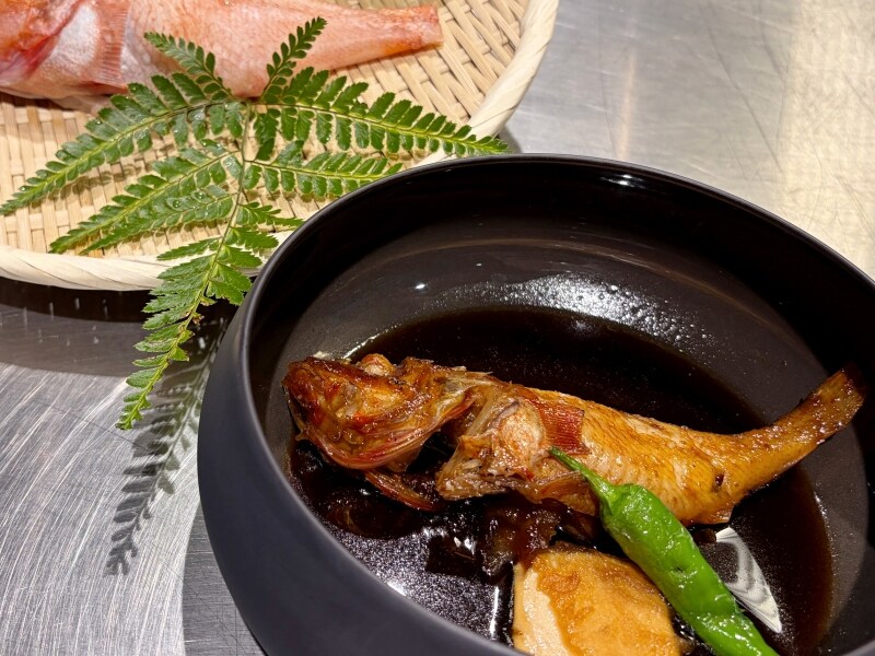 北海道・東北地方で“北の海の赤い宝石”とも称される高級魚のキンキを使った煮付け。盛りつけられた器からも、料理の格の高さを感じさせます。