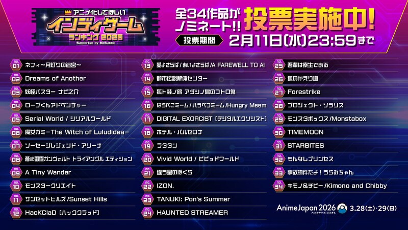 現在放送中の「グノーシア」や今春放送開始予定の「NEEDY GIRL OVERDOSE」、過去には「天穂のサクナヒメ」といった作品がアニメされているインディーゲーム。次にアニメ化が期待される作品を一般投票で選出するイベント「アニメ化してほしいインディーゲームランキング2026」の開催が発表されました。インディーゲームイベント「BitSummit」を運営するBitSummit実行委員会が、アニメ総合イベント「AnimeJapan(アニメジャパン)」と協力して実施するもので、1月26日からウェブ投票の受付を開始しています。