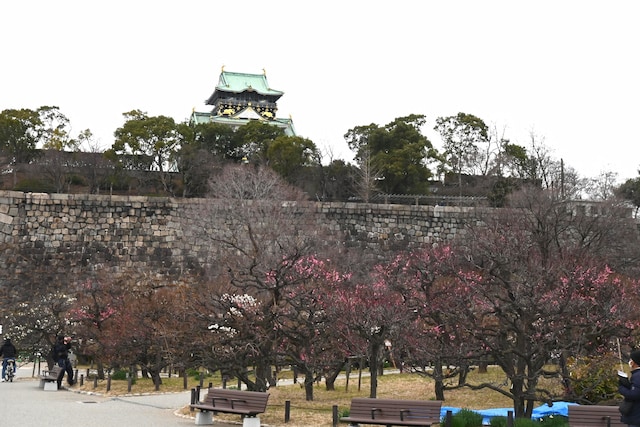 大阪城公園の「梅林」は、約1.7haの広さに105品種・約1245本がそろう関西屈指の梅スポット。早咲きから遅咲きまで開花のタイミングが異なるため、訪れる時期によってピンクと白の花の表情が変わるのも見どころです。