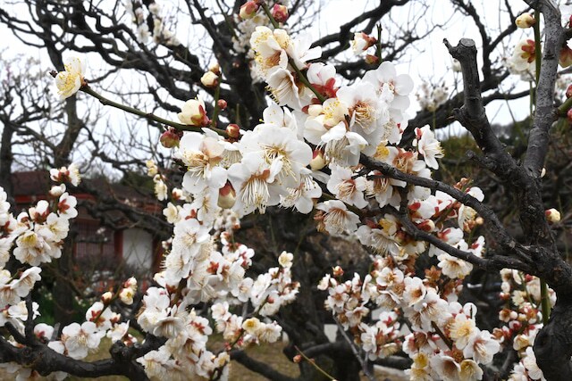 梅林の管理担当者にお話をうかがうと、「昨夏の猛暑の影響で分化が遅れたものの例年通りの開花スピードで、1月26日(月)現在は2~3割咲き。早咲き、中咲きの梅が咲き始めていますが、1月末の大寒波の影響でペースダウンするとみられています。2月中旬ごろが見頃になるでしょう」とのこと。