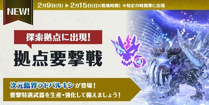 まずは拠点要撃戦に襲来する次元臨界ラドバルキンとそれに向けて開催される2つのイベントを確認していこう。
