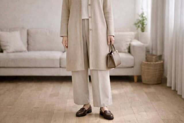 大人世代の体型カバーで意識したいのは、体を覆うことよりも縦のラインを通すこと。ウエスト位置が少しでも分かる丈のトップスや、前だけインする着方を取り入れると、自然と視線が縦に流れ、全体が引き締まって見えます。
