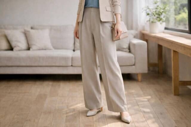 また、甲がすっきり見える靴を選ぶことで、ワイドパンツの重さが中和され、全体が軽やかな印象に。丈・トップス・足元がつながることで、ワイドパンツ本来のリラックス感を活かしながら、きれいめにも寄せやすくなるはずです。