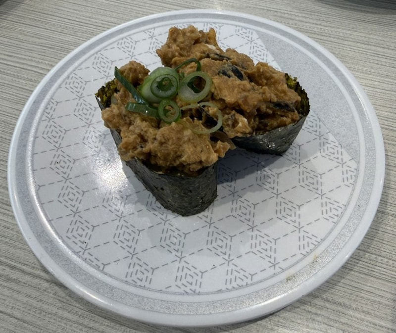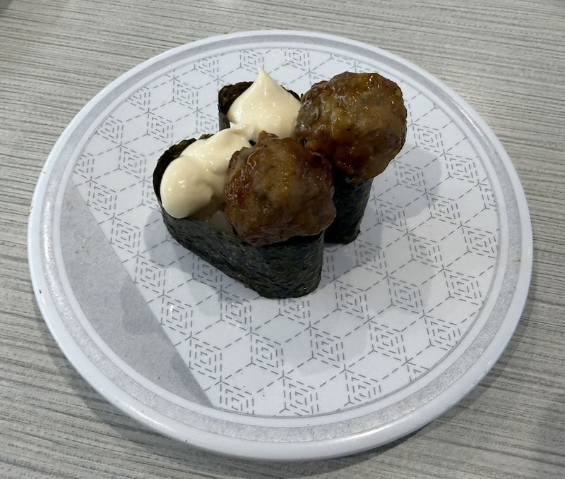 鴨つくね軍艦は、鴨肉のつくねを特製タレで甘辛く仕上げた代物。炭火の香りのする鴨つくねとマヨネーズがマッチしている。