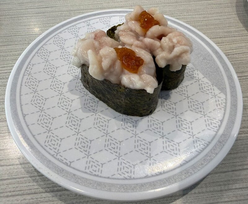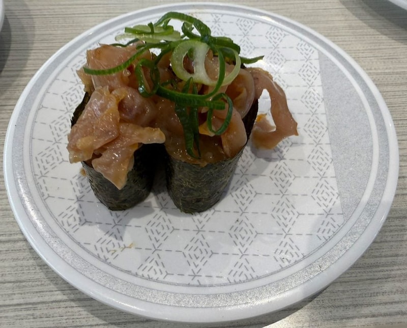 とらふぐ皮のあんきも和え軍艦(160円)。