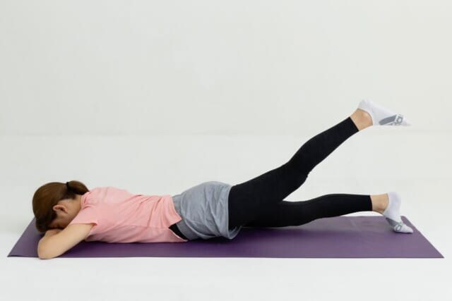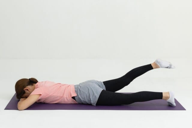 (3)息を吸って、息を吐きながらひざを伸ばしたまま左脚をゆっくり持ち上げ、上げきったところで息を吸いながら3秒間キープして、元の位置に左脚を戻す