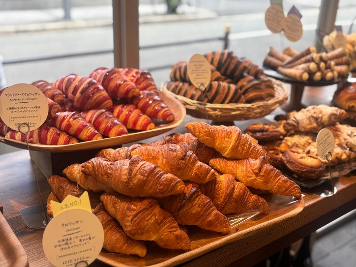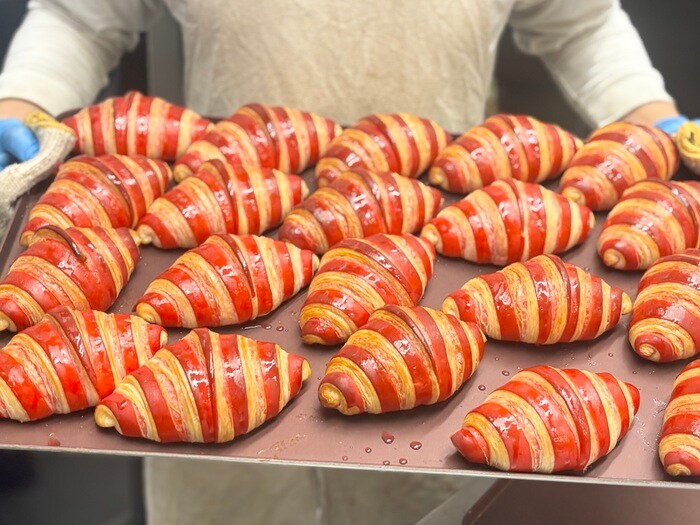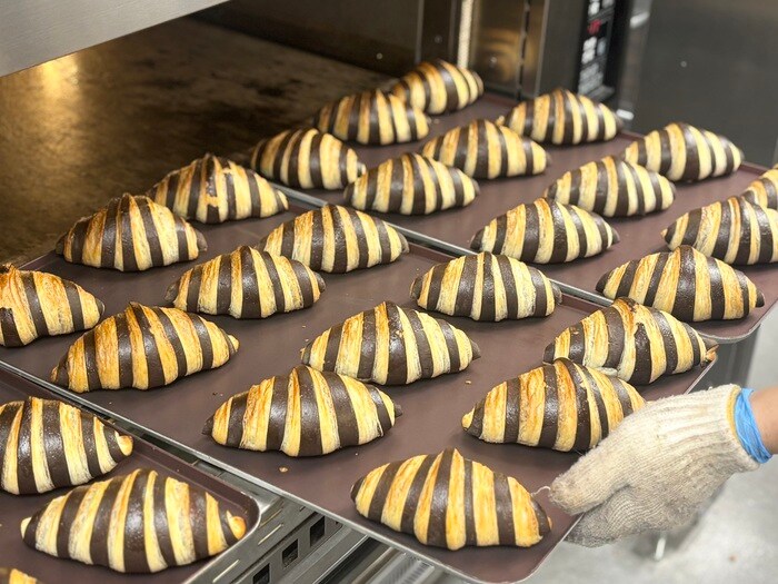 専用のオーブンから焼きあがると、綺麗に整列されたパンたちは、つやつやの甘いお化粧を施され、大人気の「フランボワーズクロワッサン」のできあがり。