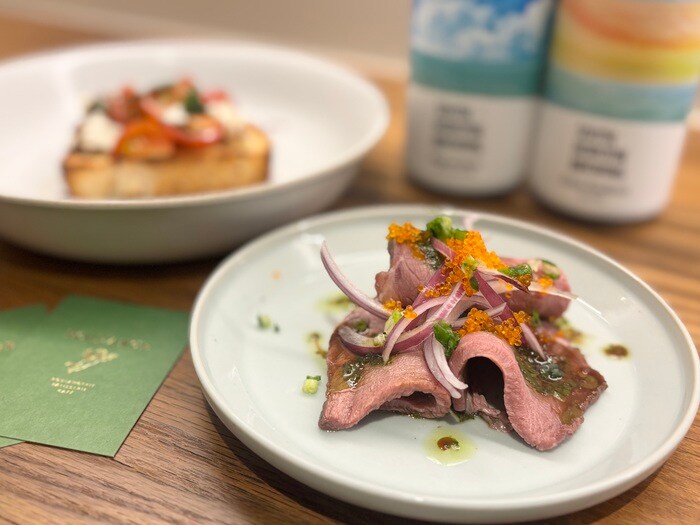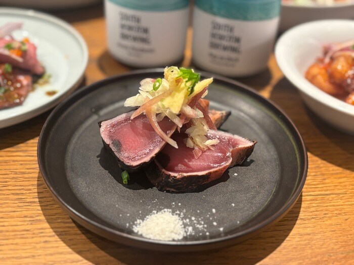 お料理も本格的!牛の旨み溢れる「切り落としローストビーフバジル醤油」や「高知産藁焼きカツオのたたき」など、ビールとの相性抜群。