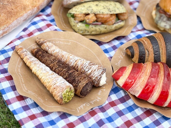 筒状のクロワッサン生地に、自家製ミルククリームを包んだ「クロワッサンコロネミルク」自家製ピスタチオクリームを包んだ「クロワッサンコロネピスタチオ」。