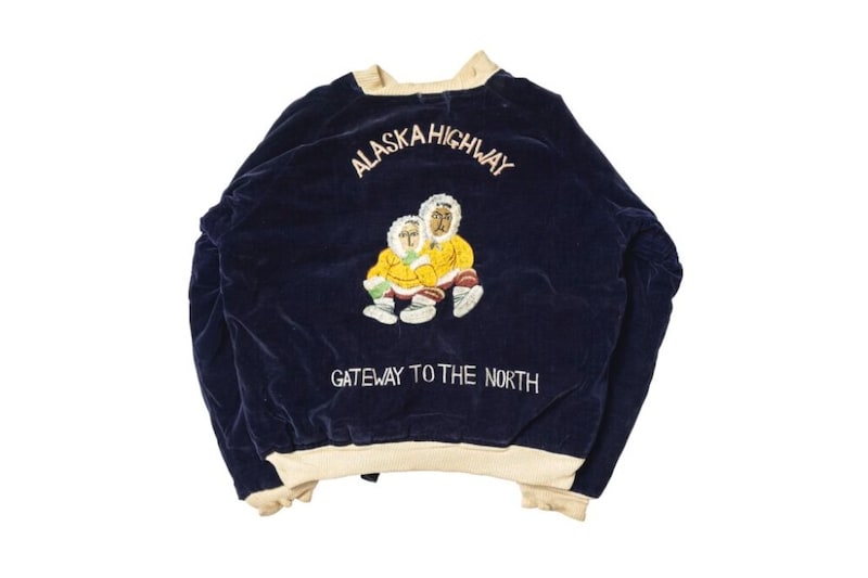 日本産とは趣の異なるアラスカのエスキモーパターン。ボディは別珍で袖には王道の犬ぞりで裏地は鹿。裏地は引きの美学を感じられるディアヘッドのみ。背面のALASKA HIGHWAYとは、軍用に建設され、戦後に一般開放された。