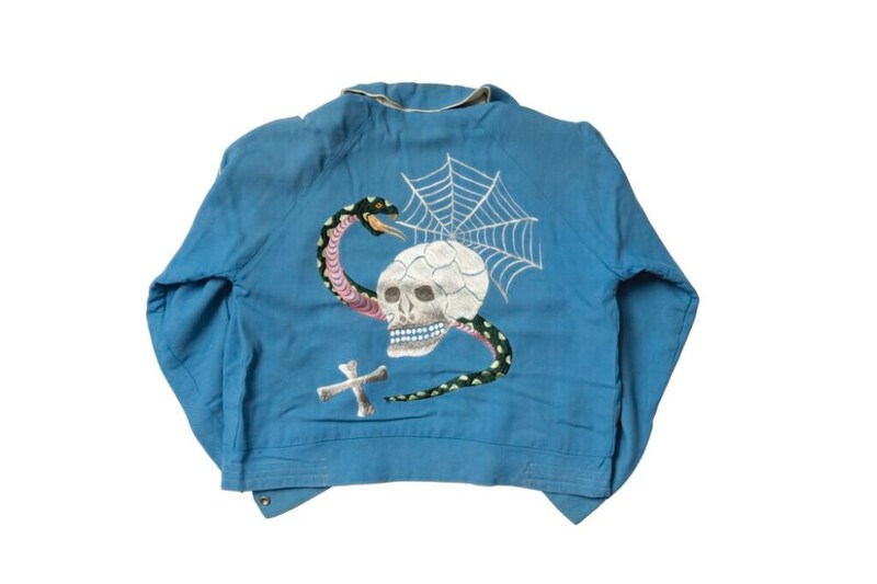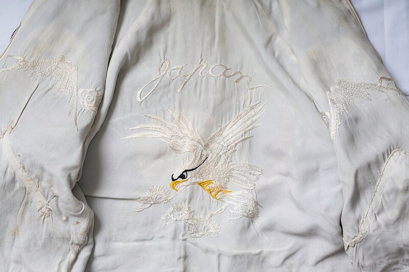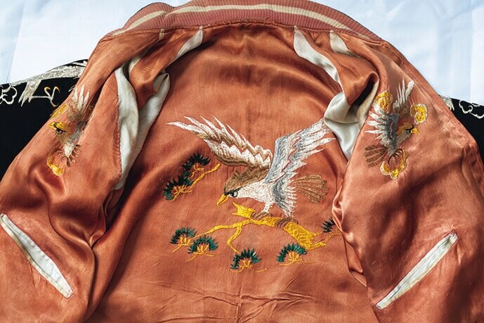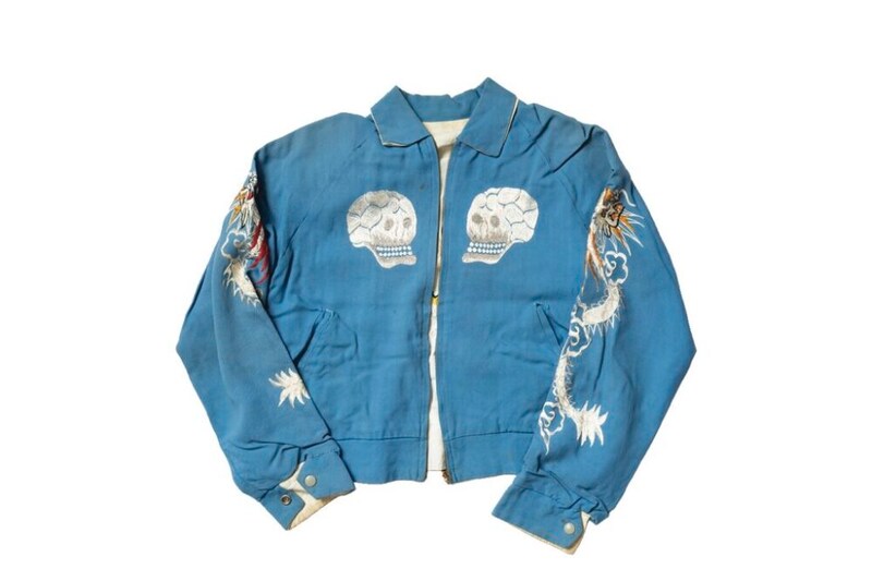 スーベニアジャケットの花形であるスカル&スネークも所有している。さらに特筆すべきはボディのデザインとカラーリング。珍しい襟付きで鮮やかなブルーが映えている。裏地はホワイト単色で、そこに同色の鷹が刺繍されている。
