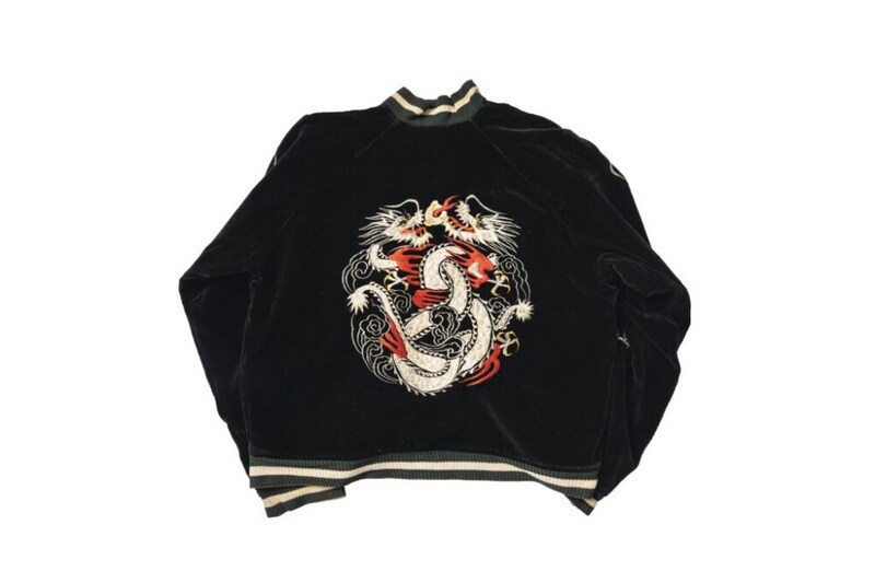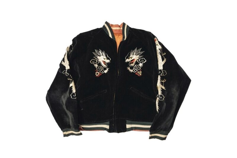 なんともレアな双龍が刺繍されたスペシャルピース。さらにボディにはブラックのコーデュロイが使われていて、ファッションとしてもレベルが高い。また袖には上から見た龍を描写しており、玉を持たない昇り龍となっている。
