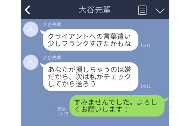 落ち込んでいる私に先輩からLINEが届きました。ただミスを責めるのではなく『あなたが損するのは、私が嫌だから』と言ってくれて…。『会社のルールだから』とか『迷惑がかかるから』ではなく、私のことを大切に思って注意してくれているんだと感じて、涙が出そうになりました」(25歳 営業事務)
