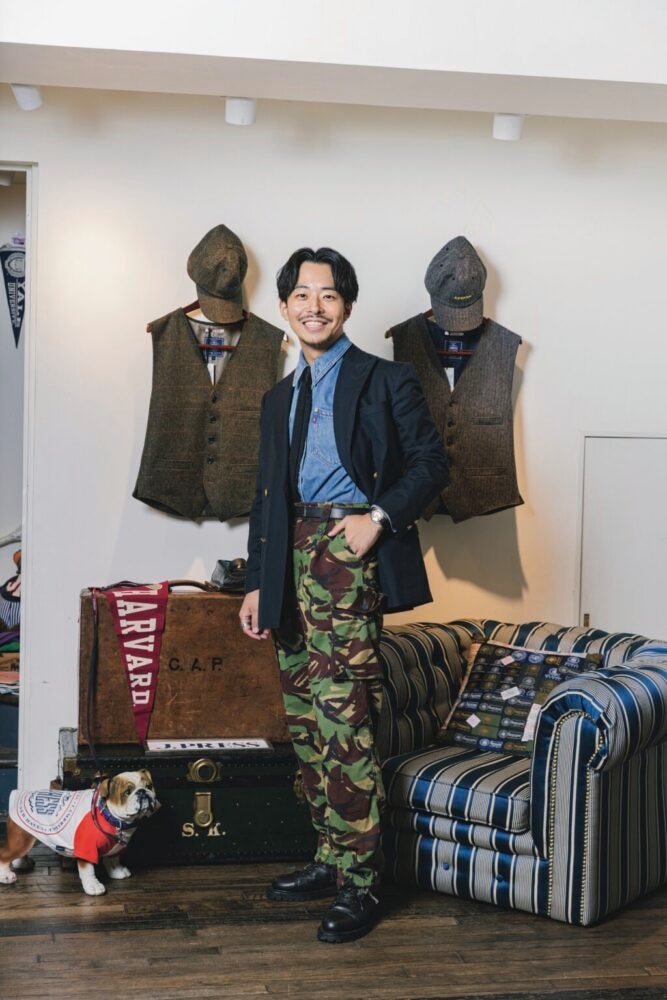 内浦さんはデニムシャツに軍パンを合わせた武骨な組み合わせを、ネイビーのブレザーとタイでスマートなミリトラスタイルに昇華。ややゴツめの革靴が全体のバランスを整えています。