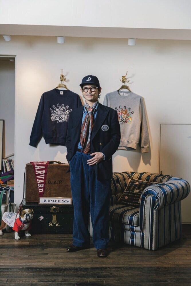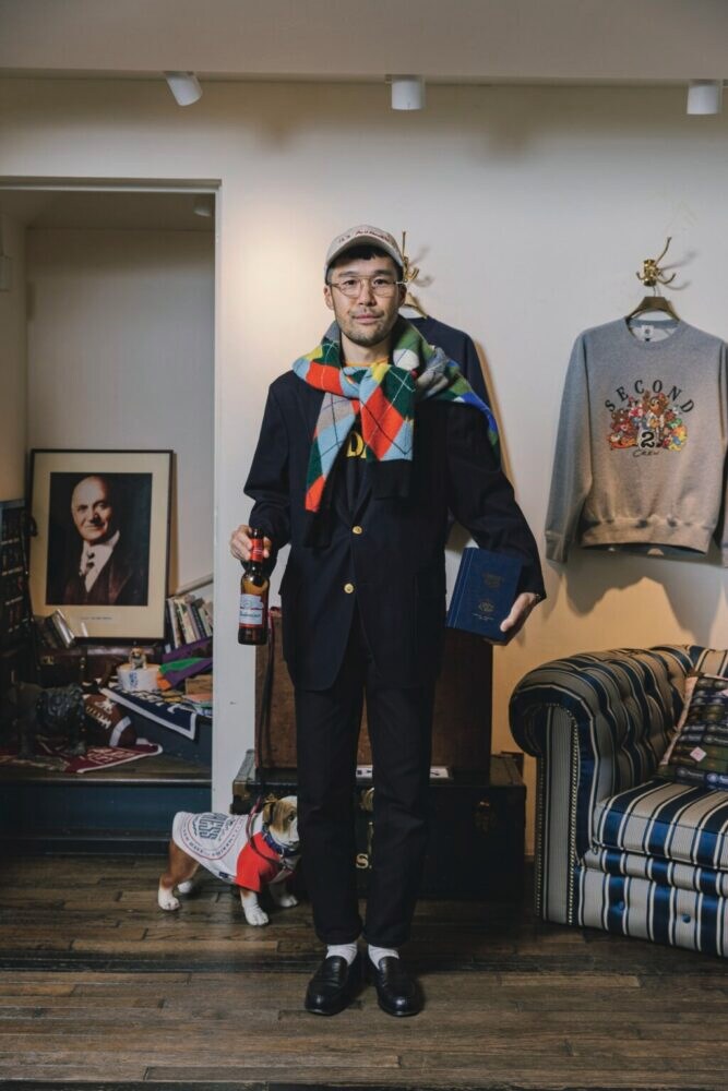 ブレザーにニットを肩掛けするスタイル、嫌いな人はいないはず! ダークトーンにカラフルなアーガイルのニットが映え、こなれた巻き方にタケヤスさんの技が光ります。