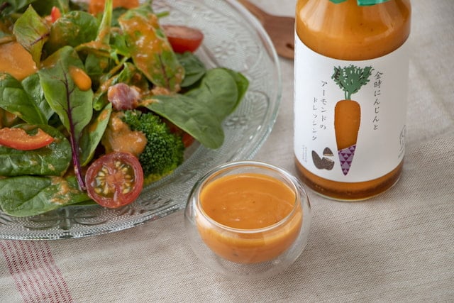 「金時にんじんとアーモンドのドレッシング」は、金時にんじんの自然な甘みと鮮やかな色合いに、アーモンドの食感をプラス。素材の甘さを活かしたまろやかで満足感のある味わいとなっています。