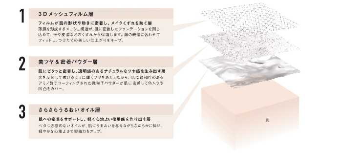 3層の美肌フィルターが「密着力」「ツヤ感のあるカバー力」「くずれにくさ」を同時に実現。独自の3Dメッシュフィルムが均一に伸び、薄づきなのに毛穴や色ムラをしっかりカバーします。