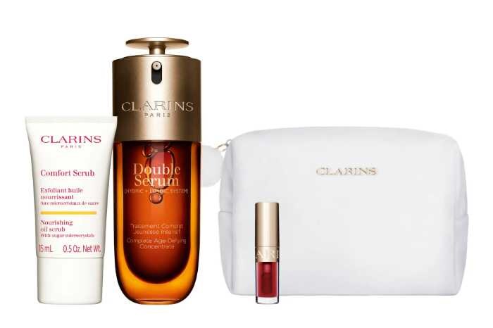 内容は、まずクラランスを代表するエイジングケア*美容液「ダブル セーラム ADC 50mL(現品)」。