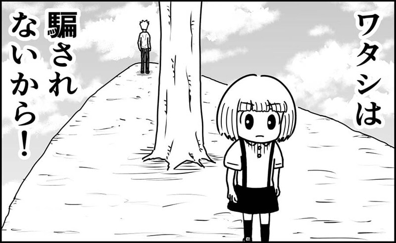 さーかさんは日常で起きたことをマンガに描き、Xに加えてKindleインディーズマンガでも作品を公開しています。今回のエッセイでも身近な出来事が描かれていますが、まるでひとつの物語のように表現されていることが特徴です。作品は、崖の上にいる「フォロワー多い人」を、木の陰に隠れてこっそり眺めるシーンから始まります。