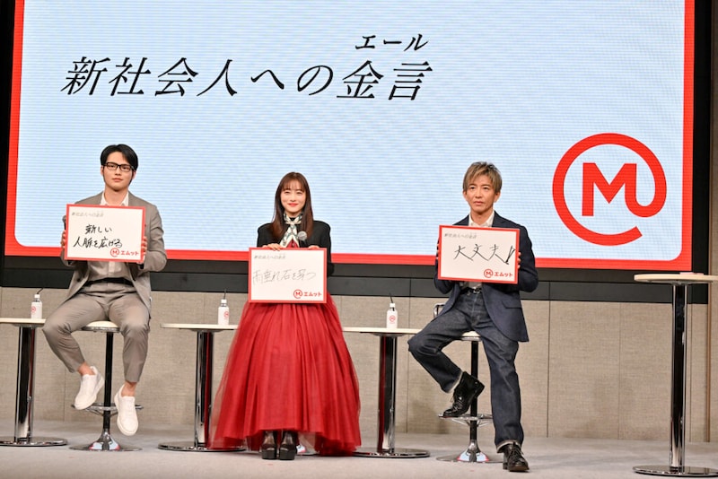 27日、都内で行われた新CM発表会では、新社会人に向けて、木村が「大丈夫!」、石原は「雨垂れ石を穿つ」。