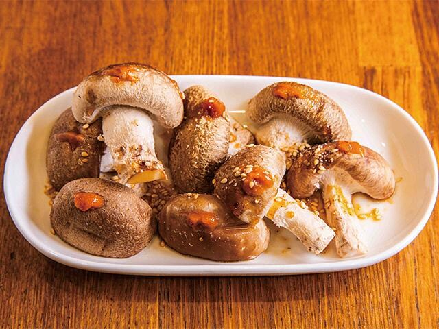 満を持して頼むのは肉ではなくシイタケだ。オリジナルの辛みそがのった面を上にしてロースターで焼くと、次第にシイタケが汗をかき始める。箸でシイタケ全体にみそを伸ばしたら、ひっくり返して軽くあぶる。