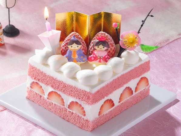 ひなまつり 苺のデコレーションケーキは、桃の節句を象徴する菱餅をイメージした華やかな仕上がり。ピンク色のスポンジで苺とシャンティクリームをサンドし、お祝い感たっぷりの限定デザインです。