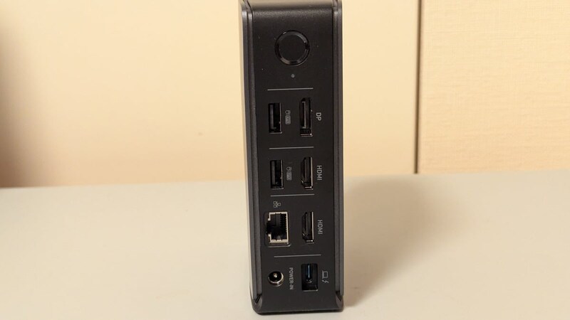 背面には4K@60HzのDisplayPort端子、最大2.5W出力で450Mbps対応のUSB-Aポート2基、4K@60HzのHDMIポート2基、1Gbps対応のイーサネットポート、ノートPCに接続する最大100W出力で10GbpsのUSB-Cアップストリームポート、最大140W入力のDC入力ポートを搭載します。最大3台のディスプレイに同時に画面出力が可能な他、最大10Gbpsの高速データ転送やノートPCへの100Wパススルー充電に対応します。USB-Cポートは映像出力には非対応。