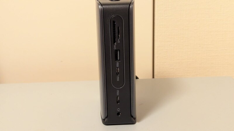 ドッキングステーション本体のサイズは約140×95×40mm、重量は約408g。前面にはSD/microSDカードスロット、最大4.5W出力で5Gbpsのデータ転送に対応するUSB-Aポート、最大7.5W出力で5Gbps対応のUSB-Cポート、最大7.5W出力で10Gbps対応のUSB-Cポート、オーディオジャックを搭載。