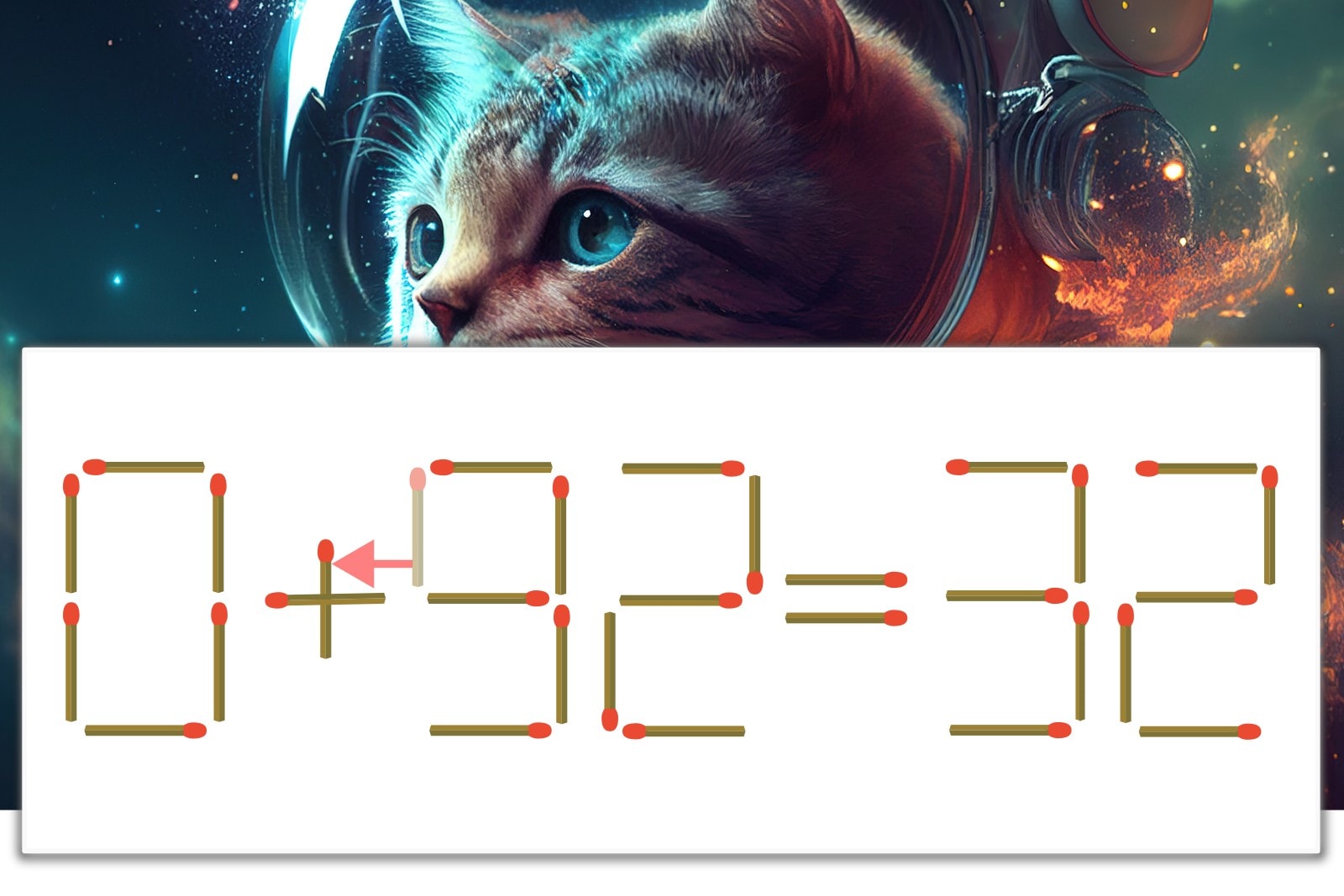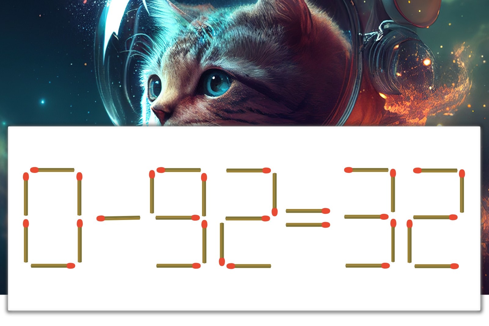 「9」を別の数字に変化させると答えが導き出せます。「9」のマッチ棒を1本移動して、「-」を「+」にしてみましょう。すると、「0+32=32」が成立します。