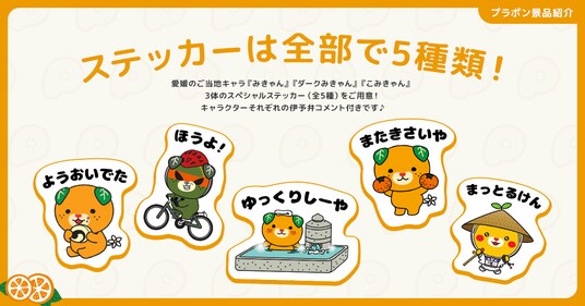 愛媛のご当地キャラ『みきゃん』『ダークみきゃん』『こみきゃん』3体のスペシャルステッカー(全5種)をご用意。キャラクターそれぞれの伊予弁コメント付きです。