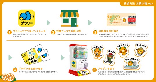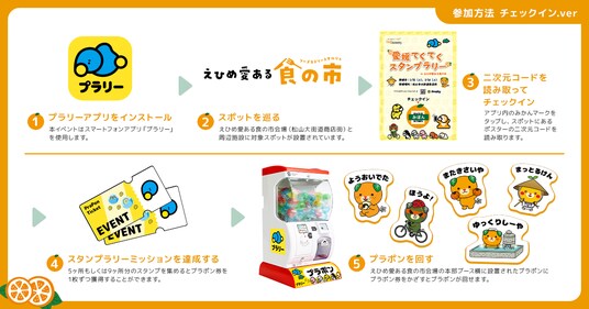 チェックインスポット5か所でスタンプを集めた参加者はプラポン券1枚を獲得し、本企画限定の景品として、ご当地キャラクター3体の「スペシャルステッカー」(全5種)と交換することができます。加えて、イベント内の対象ブースでのお買い物でプラポン券との引換券を獲得することも可能です。また、カプセルの中には、愛媛のかんきつ3種セットがプレゼントされる「あたり」も含まれています。