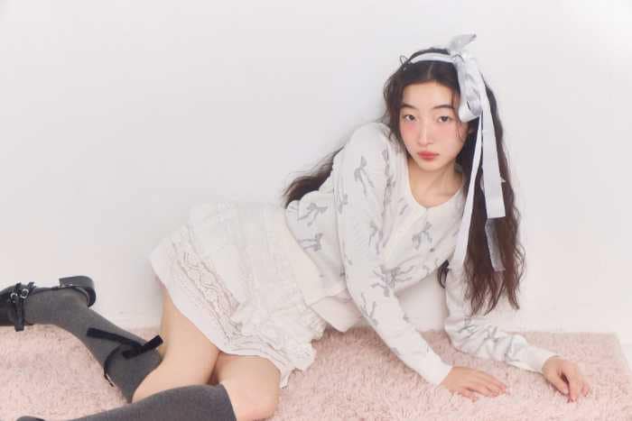 フィリーチョコレートリボンニットカーディガンは、価格7,190円、カラーIVORY/NAVY、サイズはフリー。フィリーチョコレートリボンソックスは2,200円、GRAY/BLACKの2色展開、サイズはフリーです。