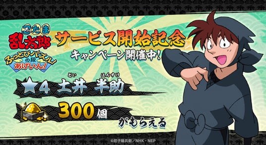 『忍たま乱太郎 ふっとびパズル!の段 あげいん!』ではサービス開始を記念し、キャンペーンを実施いたします。本キャンペーンでは、全ユーザーを対象に、★4キャラクター「土井半助」および、プレミアムガチャを10回プレイできる「砂金300個」をプレゼントいたします。