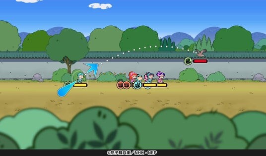 可愛らしいミニキャラになった忍たまたちを飛ばして敵を倒す、直感的でテンポの良いバトルが魅力です。登場キャラクターは40体以上にのぼり、最大6人まで編成できる部隊を組んで、さまざまなステージに挑戦していきます。