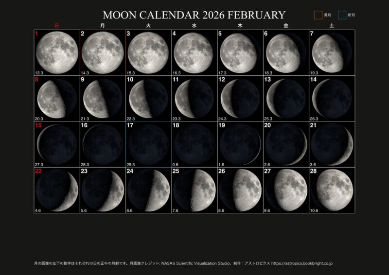 アストロピクスでは昨年末、2026年の1年間の月の満ち欠け(月齢)のカレンダーと2026年1月の月齢カレンダーを掲載しました。今回紹介するのは、編集部で作成した2026年2月の月の満ち欠けカレンダーです。