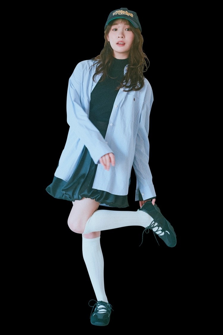 シャツ 18,700円、バルーンスカート 16,500円/ともにリランドチュール タートルニットトップス 5,940円/EMODA ルミネエスト新宿店 キャップ 6,600円/Mardi Mercredi(MARDI MERCREDI JAPAN)スニーカー 15,400円/Rockfish Weatherwear(blaseout)ソックス/スタイリスト私物