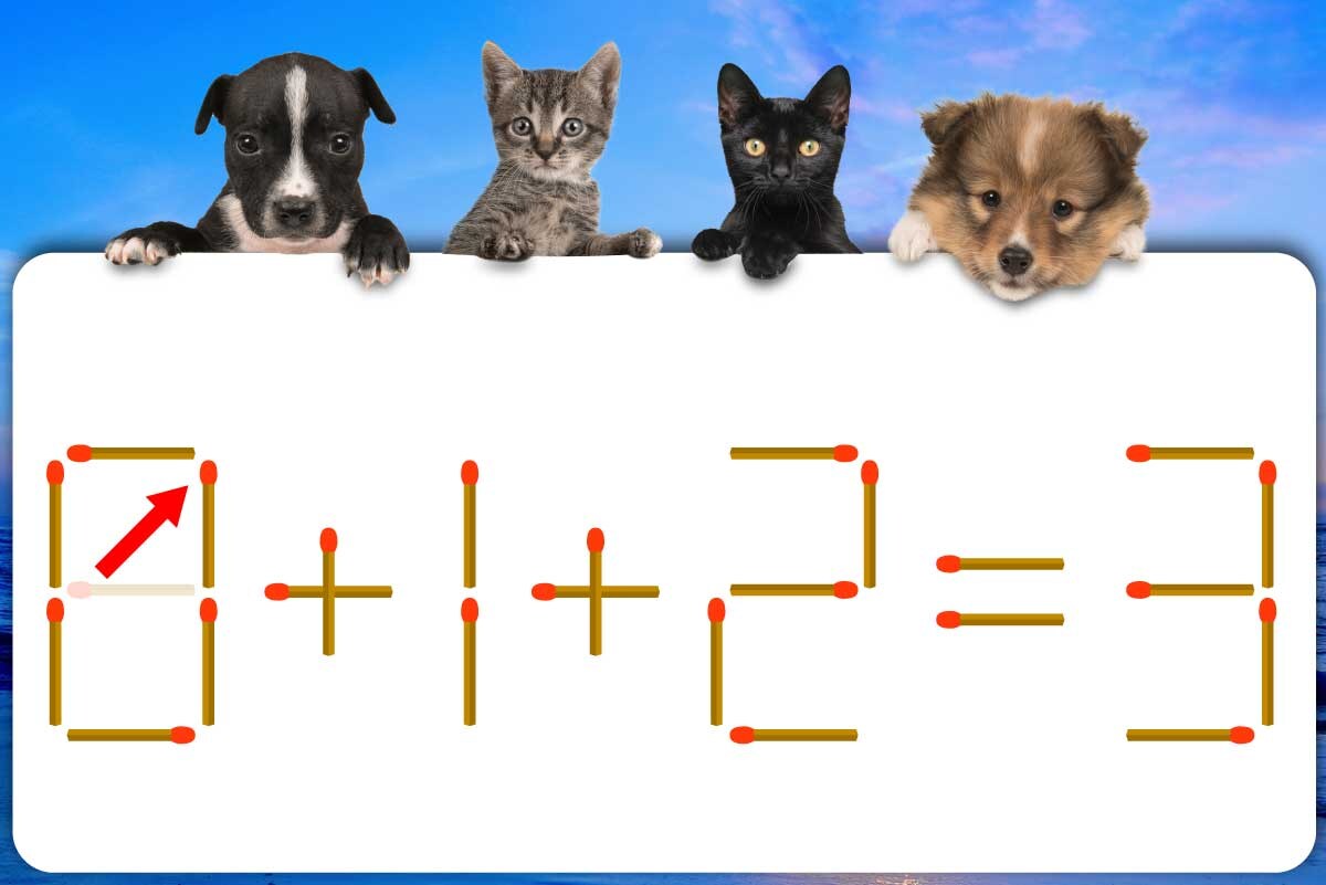 「6」のマッチ棒を1本移動させて「0」を作り「0+1+2=3」にする。※解答は複数ある場合があります。