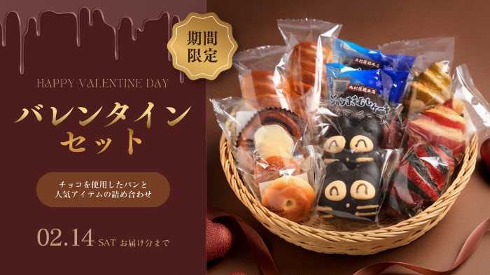 バレンタインセットは、酒種あんぱん桜、あまおう苺をはじめ、チョココロネ×2、ねこちゃん×2、シナモンロール、あんクロワッサン3種(こし×ラズベリー、抹茶×ホワイトチョコ、あまおう苺あん×チョコ)、ジャンボむしケーキ冬のチョコ×2を詰め合わせ。