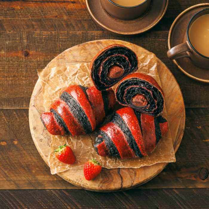 バレンタインおすすめ商品として、あんクロワッサン(あまおう苺あん×チョコ)5入も登場。赤と黒の深みある生地で、チョコの甘みと苺あんのほのかな酸味が調和した味わいが魅力です。