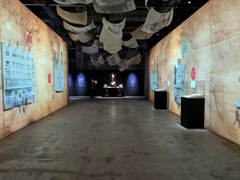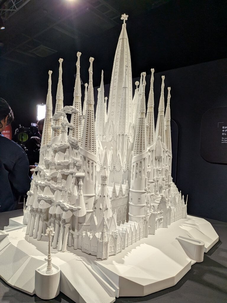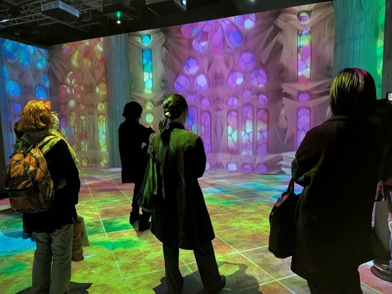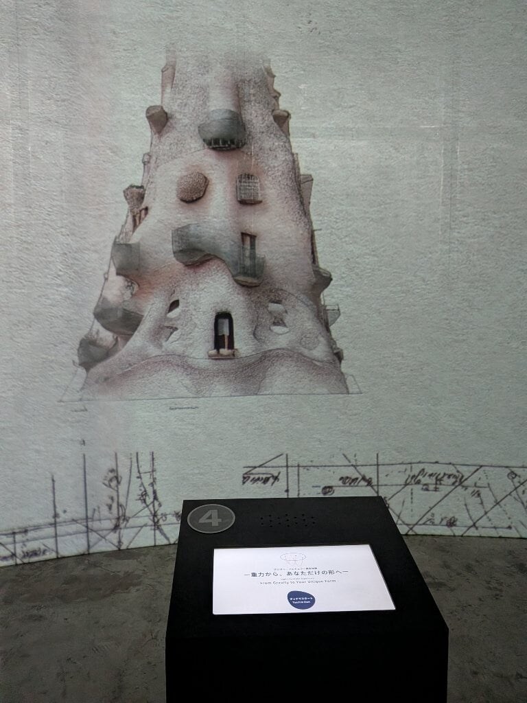 展示の後半には、壁に投影されたプロジェクションマッピングで、サグラダ・ファミリアができるまでの時間の流れを体感できる没入型作品もありました。美しい映像に包まれ、ステンドグラスの光も疑似体験。今、ユーロは高騰し続け、飛行機のルートは遠く直行便はなし、2026年後半からはEUはビザが必要になります。主要な塔が完成する2026年は現地はさらに混雑することでしょう。そして現地に行ってわかったのですが、周辺はスリが多いです。現実のサグラダ・ファミリアが遠くなっていきますが、この展示では近くて安全で快適な環境でガウディのクリエイティビティに触れることができました。