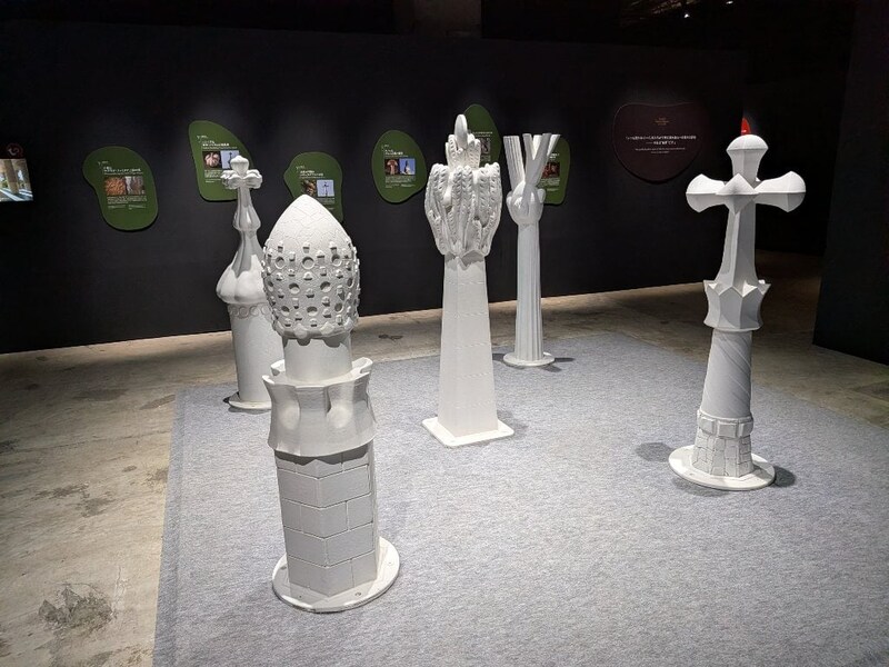展示室に入ってまず目に入ったのは、有機的な形状の塔の先端の模型。サグラダ・ファミリアやガサ・パトリョ、グエル公園などガウディ建築の塔の先端は、小麦の穂やニンニク、糸杉、キノコなど自然の造形を模していました。自然に囲まれて育ったガウディは自然を師とし、造形センスを育んでいたようです。
