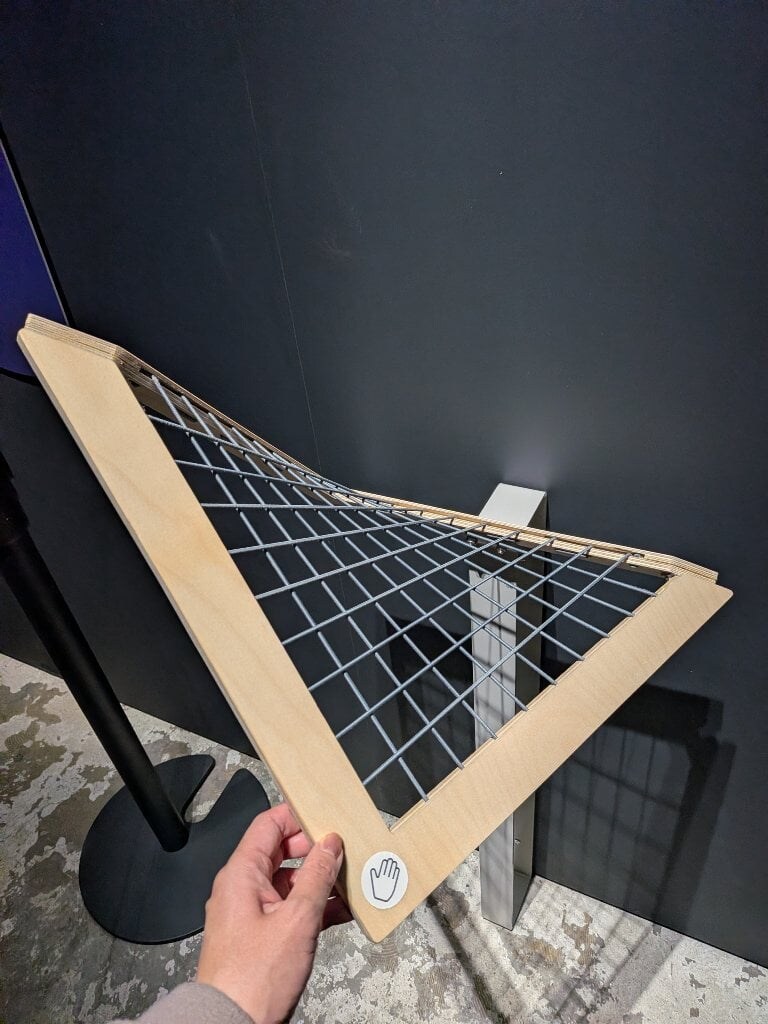若い頃から次々と独創的な建築を手がけていたガウディ。ゴシック様式を「再発明」し、伝統と革新を融合させた作品を生み出しました。有機的な造形や、光を取り入れるテクニック、吊り下げたロープを逆転させたデザインなど、他では見られない手法です。展示スペースには、実際にガウディの構造哲学を体験できるコーナーもありました。フレームに張った直線のひもを曲げることで双極放物線になるなど、直線から曲線を作る方法を再現できます。