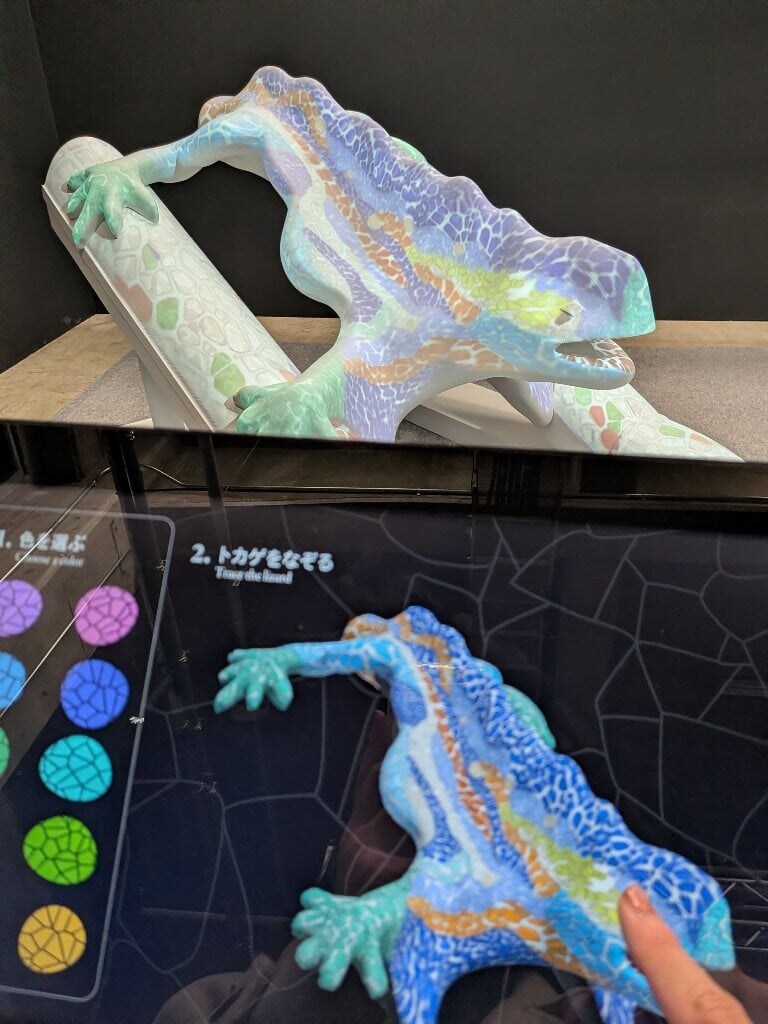 NAKEDならではの、インタラクティブなしかけや没入型の展示も。壁に投影されたガウディ建築のビジュアルに触れると、一瞬で色がつき、街の人々が動き出します。グエル公園の有名なトカゲのモザイクに好きな色を塗れるプロジェクションマッピングも楽しいです。