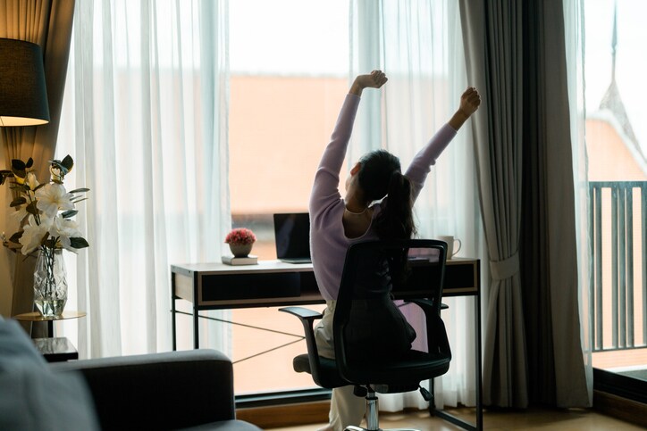 肩回しや足首の曲げ伸ばしなど、椅子に座ったままでもできるストレッチをしてみましょう。30分に1回は立ち上がるなど、自分でリズムを作るのもおすすめです。
