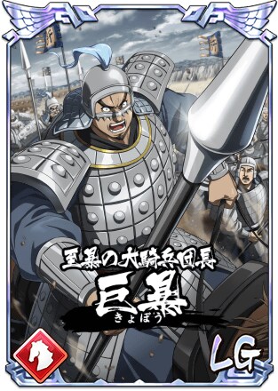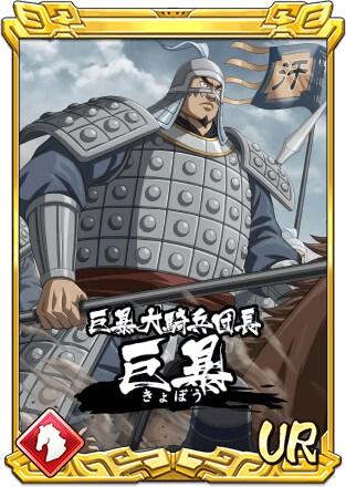兵士一人ひとりが蒙武並みの巨躯を誇る大騎兵団を率いる巨暴は、騎兵らしいスキルと強力なダメージ武技を持つ武将です。