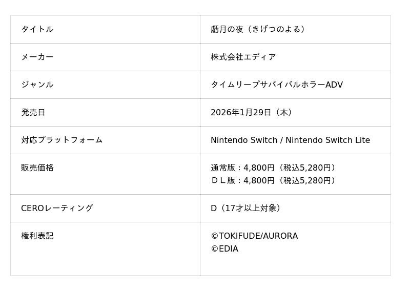 株式会社エディア(本社:東京都千代田区、代表取締役社長:賀島 義成、以下:エディア)は、Nintendo Switch向けタイムリープサバイバルホラーADVゲーム『虧月の夜』を本日2026年1月29日(木)に発売したことをお知らせいたします。