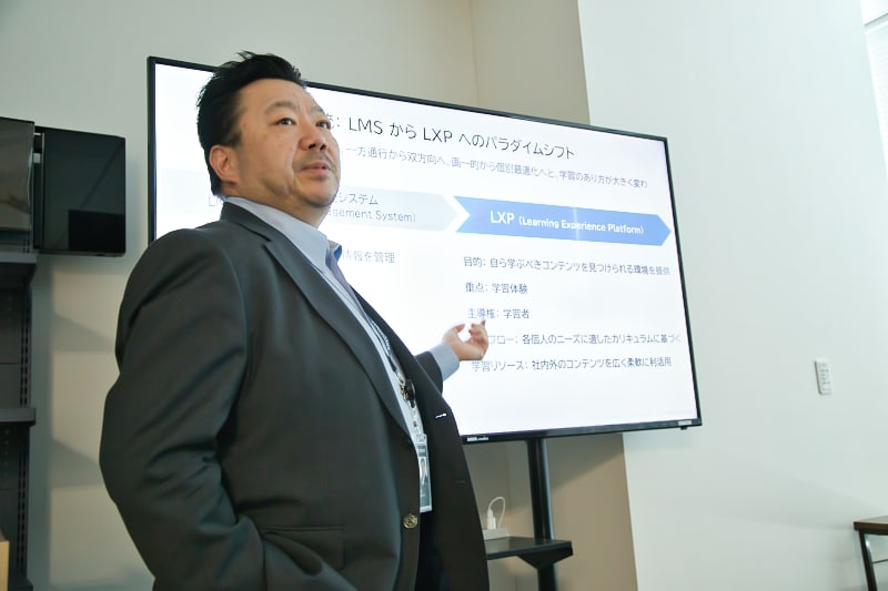 「実は当社でも数年前に、IDP(個別育成プラン)を導入しようとしたんですが、頓挫してしまいました」とマツハシ氏。従業員一人ひとりと面談を重ね、ニーズを把握し、カリキュラムを組んでいく作業は、マニュアルでは大変な負担だったのです。「AIの進化によって、ようやくここが実現できるようになってきています。それが今、LXPへのパラダイムシフトが起きている理由です」。