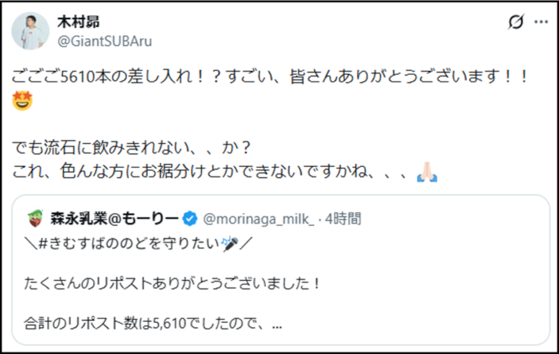 さらに、木村昴さん本人もSNS上で反応し「よかったらみんなもリポストして」といった趣旨の投稿で参加を呼びかけたことで、最終的に5,610のリポスト数(差し入れ本数)が集まったのだそう。