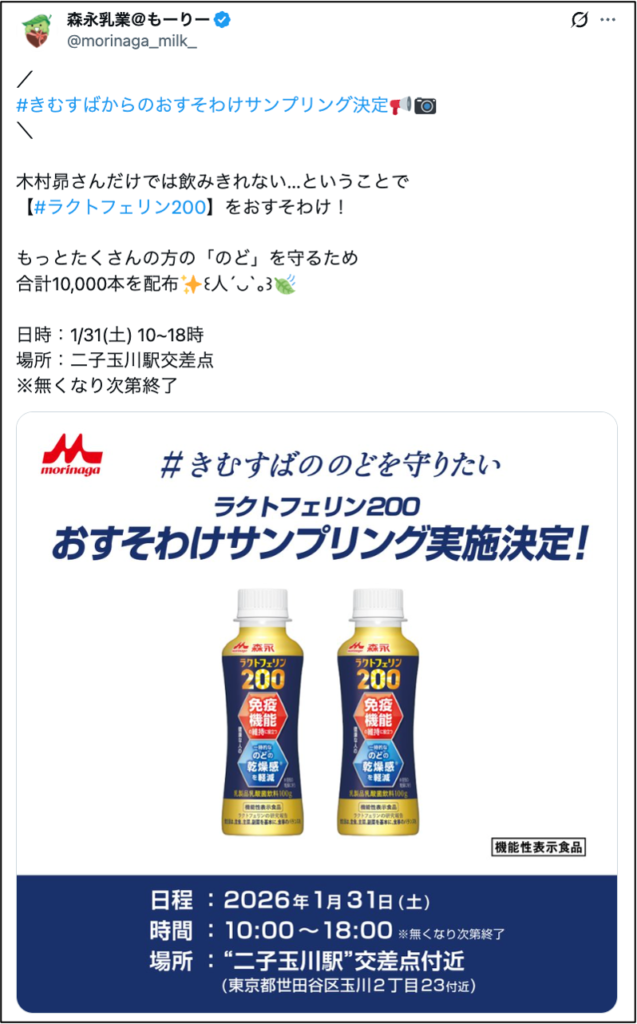 森永乳業は2026年1月31日に、公式Xで実施した声優・木村昴さんへのどをケアするドリンク“森永ラクトフェリン200ドリンクタイプ”が差し入れされる「#きむすばののどを守りたい」キャンペーンにおいて、二子玉川駅周辺で「森永ラクトフェリン200ドリンクタイプ」の街頭サンプリングを緊急開催することを発表しました。